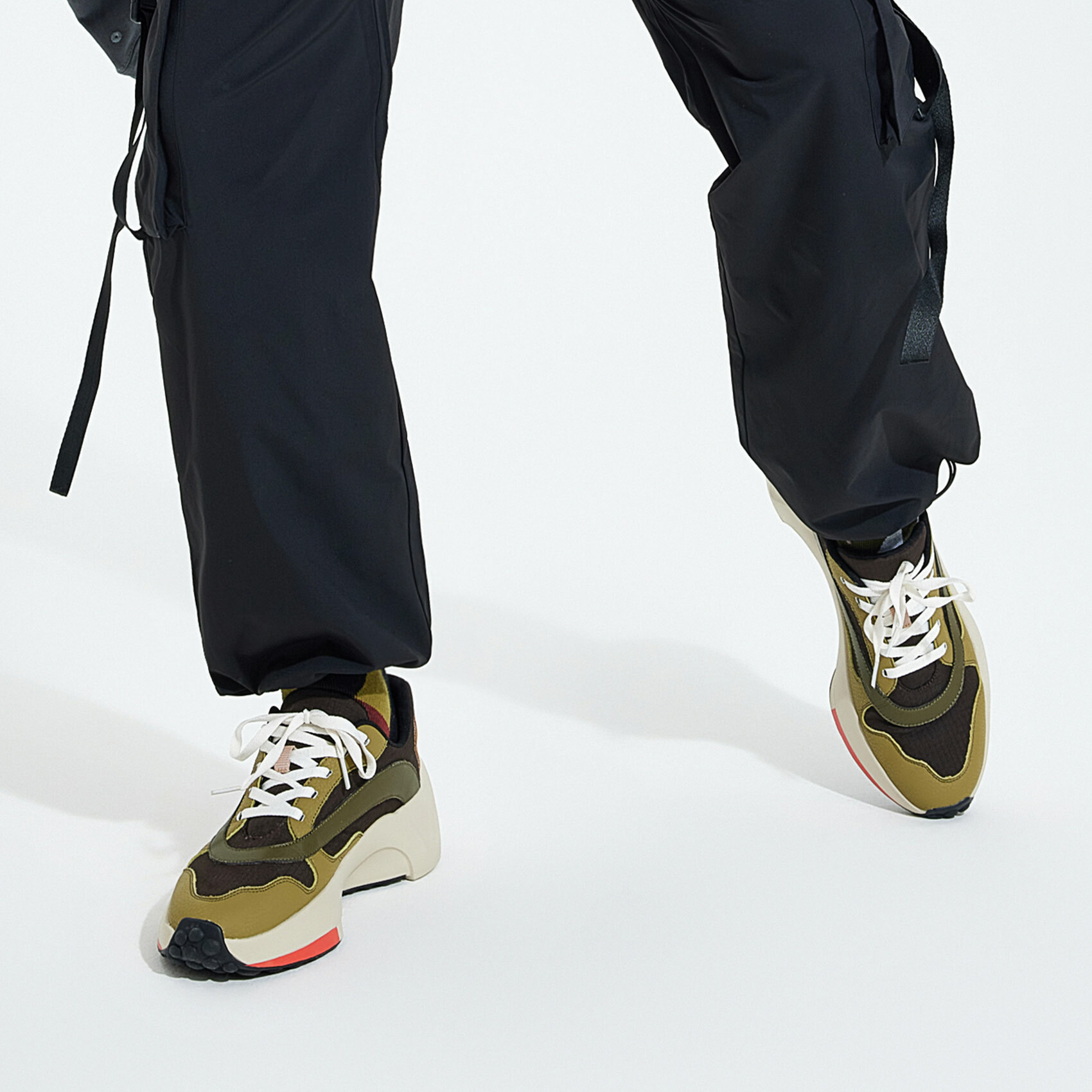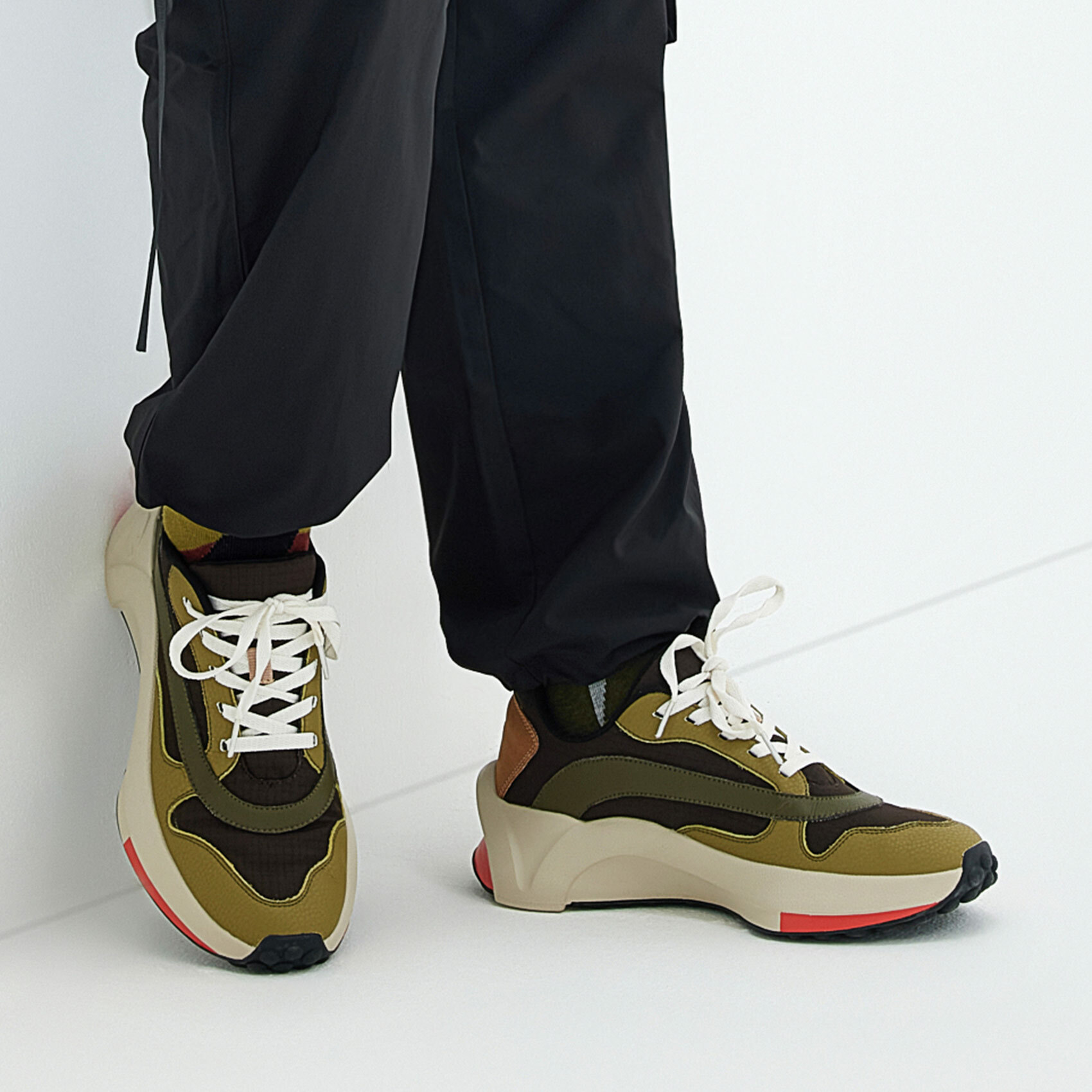 尼龍布+超纖皮鞋面 | 緩震EVA中底 | 流線型鞋邊牆設計 | 不規則鵝卵石全腳掌橡膠鞋底